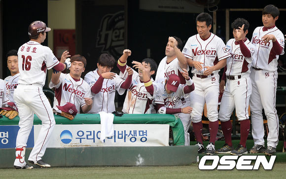 8일 오후 서울 목동야구장에서 열린 2013 한국야쿠르트 세븐프로야구 넥센 히어로즈와 두산 베어스의 경기, 4회말 2사 1루에서 넥센 강정호가 동점 투런 홈런을 치고 덕아웃에서 동료들의 축하를 받고 있다.