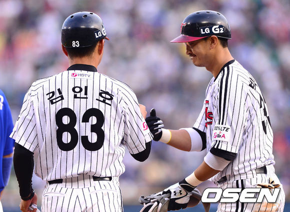 8일 오후 서울 잠실구장에서 열린 '2013 한국야쿠르트 세븐 프로야구' LG 트윈스와 삼성 라이온즈의 경기, 4회말 2사 1,2루 LG 박용택이 1타점 적시타를 날리고 김인호 코치와 하이파이브를 하고 있다