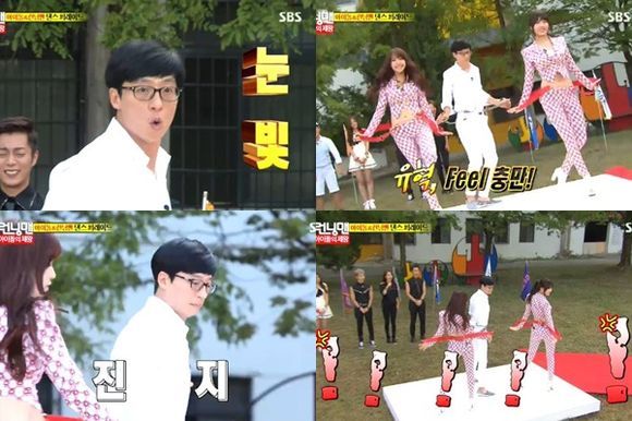 이날 민아, 유라와 한 팀을 이룬 유재석은 등장과 함께 걸스데이의 곡 '기대해'의 안무를 선보였다.