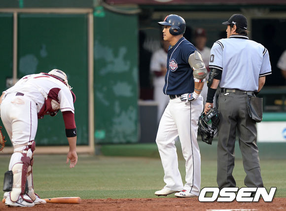 8일 오후 서울 목동야구장에서 열린 2013 한국야쿠르트 세븐프로야구 넥센 히어로즈와 두산 베어스의 경기, 5회초 2사 1루에서 두산 홍성흔이 나광남 주심의 스트라이크 판정에 강하게 어필하고 있다.