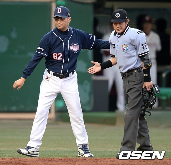 8일 오후 서울 목동야구장에서 열린 2013 한국야쿠르트 세븐프로야구 넥센 히어로즈와 두산 베어스의 경기, 5회초 2사 1루에서 두산 홍성흔이 나광남 주심의 스트라이크 판정에 강하게 항의하자 김진욱 감독이 상황을 진정 시키고 있다.