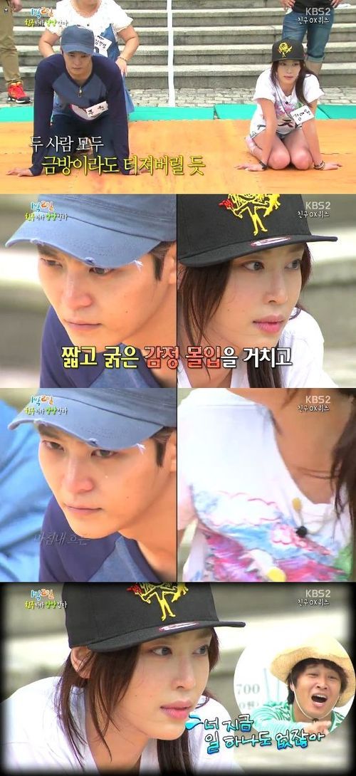 주원은 8일 오후 방송된 KBS 2TV 예능프로그램 '해피선데이-1박2일'에서 배우 강예원과 눈물 빨리 흘리기 대결에 임했다. 두 사람은 각자 감정에 몰입하며 눈물을 흘리려 애썼다.