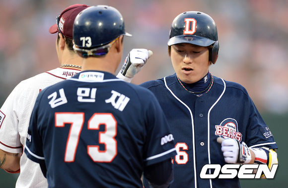 8일 오후 서울 목동야구장에서 열린 2013 한국야쿠르트 세븐프로야구 넥센 히어로즈와 두산 베어스의 경기, 5회초 2사 1,3루에서 두산 이원석이 우전 적시타를 치고 환호하고 있다.