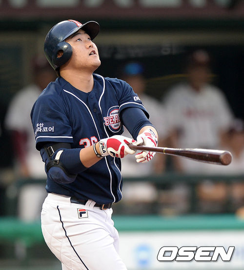 8일 오후 서울 목동야구장에서 열린 2013 한국야쿠르트 세븐프로야구 넥센 히어로즈와 두산 베어스의 경기, 5회초 1사 1,3루에서 두산 오재일이 희생플라이를 치고 타구를 바라보고 있다.