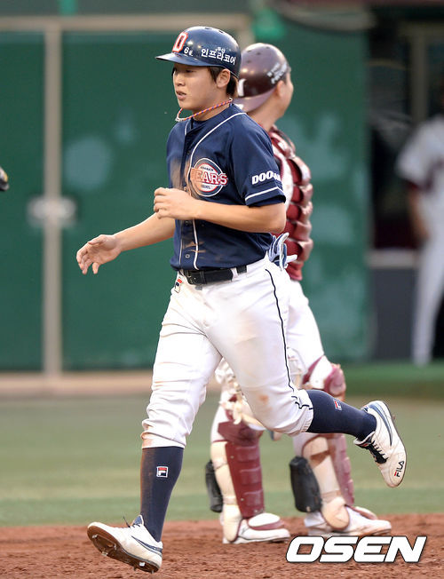 8일 오후 서울 목동야구장에서 열린 2013 한국야쿠르트 세븐프로야구 넥센 히어로즈와 두산 베어스의 경기, 5회초 1사 1,3루에서 두산 오재일의 희생플라이 때 3루주자 정수빈이 홈을 밟고 있다.