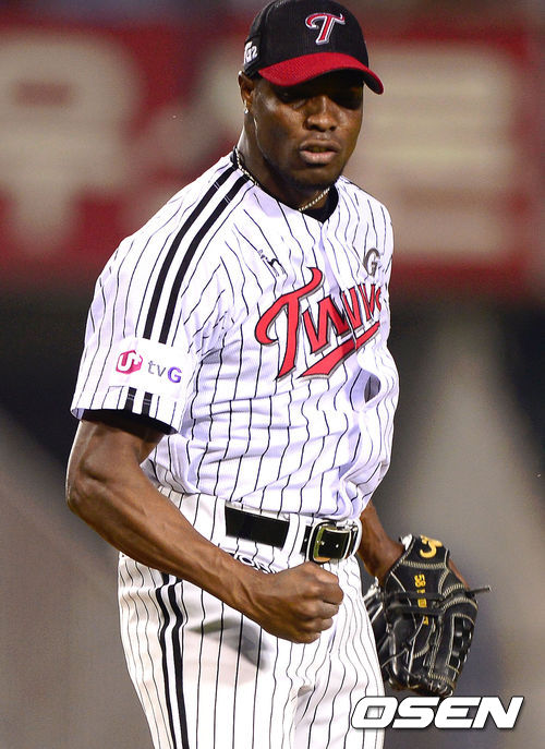 8일 오후 서울 잠실구장에서 열린 '2013 한국야쿠르트 세븐 프로야구' LG 트윈스와 삼성 라이온즈의 경기, 6회초 무사 1,2루 위기에서 연속 세타자 삼진으로 잡은 LG 선발투수 리즈가 환호하고 있다