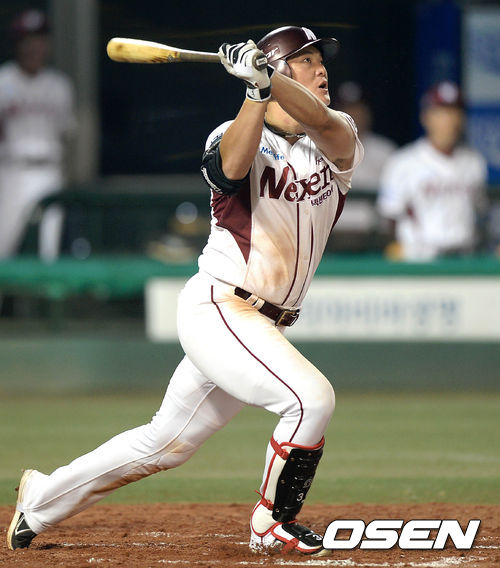 8일 오후 서울 목동야구장에서 열린 2013 한국야쿠르트 세븐프로야구 넥센 히어로즈와 두산 베어스의 경기, 7회말 1사에서 넥센 이성열이 우월 동점 솔로포를 치고 있다.
