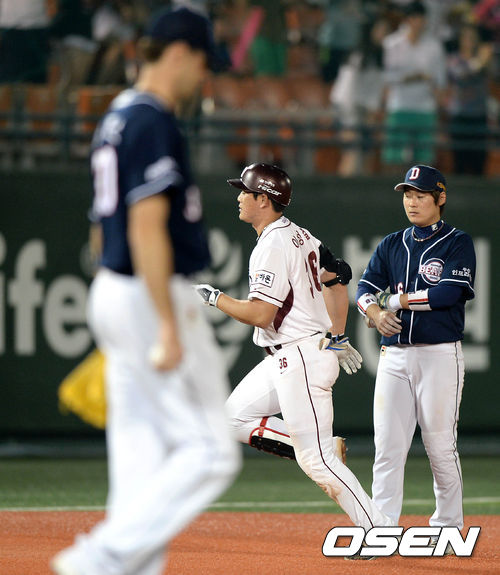 8일 오후 서울 목동야구장에서 열린 2013 한국야쿠르트 세븐프로야구 넥센 히어로즈와 두산 베어스의 경기, 7회말 1사에서 넥센 이성열이 우월 동점 솔로포를 치고 그라운드를 돌고 있다.