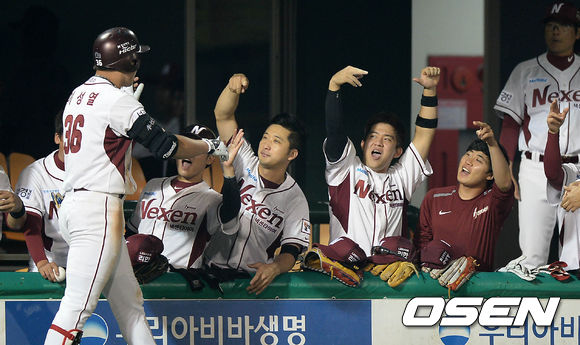 8일 오후 서울 목동야구장에서 열린 2013 한국야쿠르트 세븐프로야구 넥센 히어로즈와 두산 베어스의 경기, 7회말 1사에서 넥센 이성열이 우월 동점 솔로포를 치고 덕아웃에서 동료들의 축하를 받고 있다.