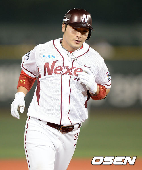 8일 오후 서울 목동야구장에서 열린 2013 한국야쿠르트 세븐프로야구 넥센 히어로즈와 두산 베어스의 경기, 8회말 1사 2루에서 넥센 박병호가 좌월 역전 투런 홈런을 치고 그라운드를 달리고 있다.