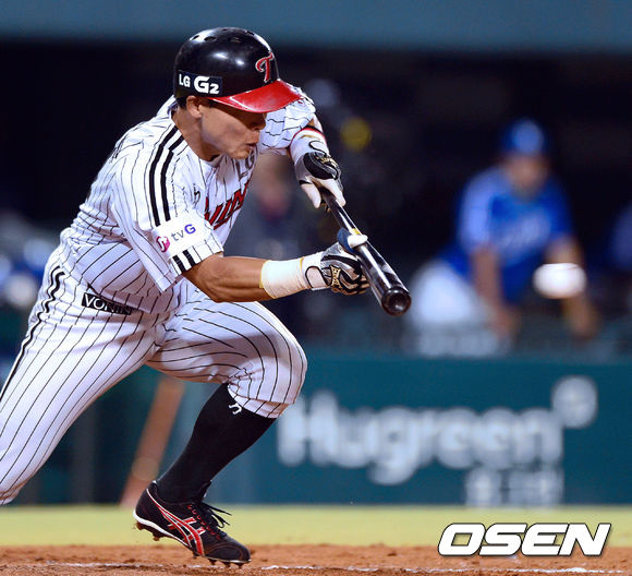 8일 오후 서울 잠실구장에서 열린 '2013 한국야쿠르트 세븐 프로야구' LG 트윈스와 삼성 라이온즈의 경기,7회말 1사 1,2루 LG 현재윤이 기습번트를 성공하고 있다