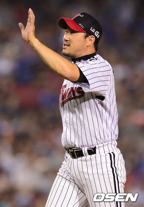 8일 오후 서울 잠실구장에서 열린 '2013 한국야쿠르트 세븐 프로야구' LG 트윈스와 삼성 라이온즈의 경기,8회초 2사 만루 삼성 김태완의 타석때 LG 봉중근 투수가 공이 몸에 맞지 않았다는 제스처를 보이고 있다