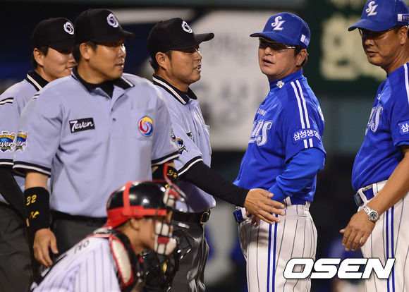 8일 오후 서울 잠실구장에서 열린 '2013 한국야쿠르트 세븐 프로야구' LG 트윈스와 삼성 라이온즈의 경기,8회초 2사 만루 삼성 김태완의 볼 판정에 삼성 류중일 감독이 항의하고 있다.
