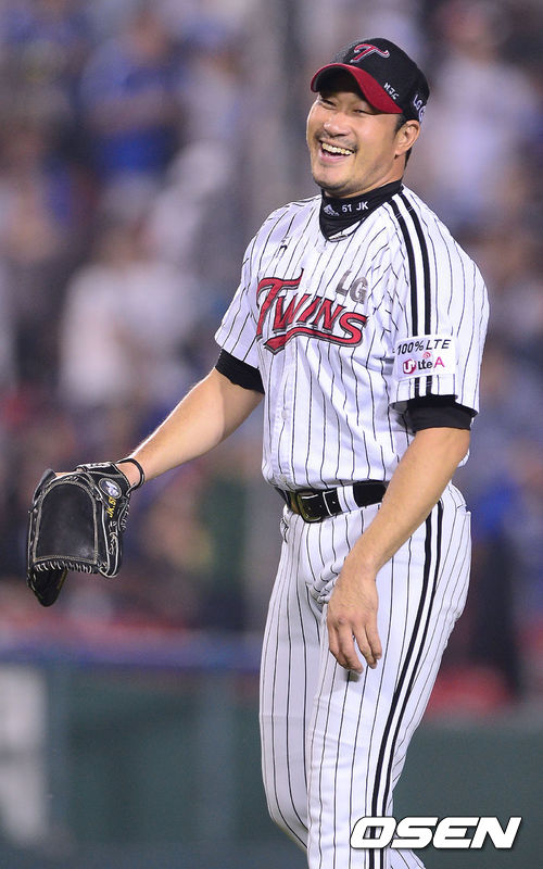 9회말 2사 삼성 정형식의 타구를 펜스 앞에서 잡아내며 승리를 지켜낸 LG 마무리 투수 봉중근이 미소 짓고 있다 . / soul1014@osen.co.kr