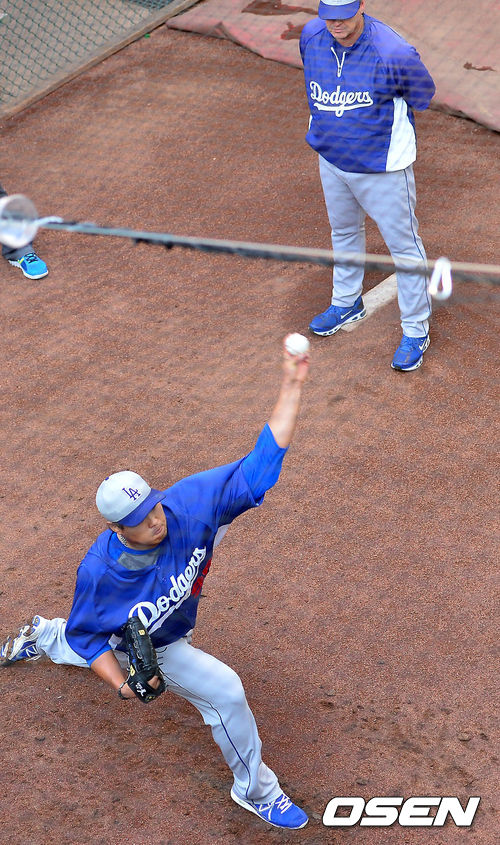 9일 (이하 한국시간) 미국 오하이오주 신시내티 그레이트 아메리칸 볼파크에서 2013 메이저리그 신시내티 레즈와 LA 다저스의 경기가 열릴 예정인 가운데 양팀 훈련시간에 다저스 류현진이 불펜에서 등판일 결정을 위한 불펜피칭을 하고 있다.