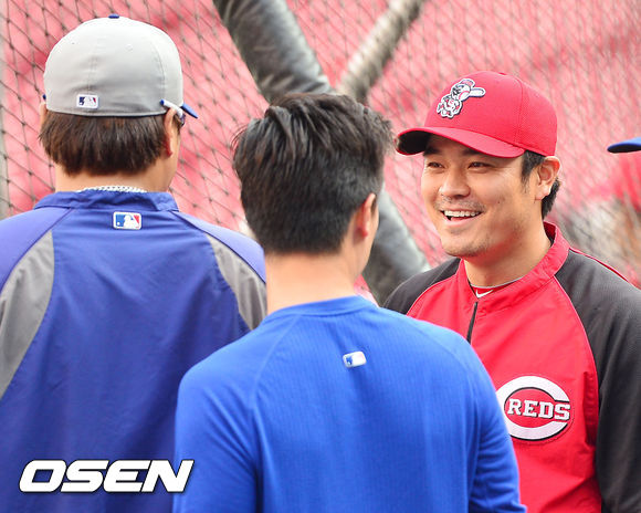 9일 (이하 한국시간) 미국 오하이오주 신시내티 그레이트 아메리칸 볼파크에서 2013 메이저리그 신시내티 레즈와 LA 다저스의 경기가 열릴 예정인 가운데 양팀 훈련시간에 신시내티 추신수와 다저스 류현진이 얘기를 나누고 있다.