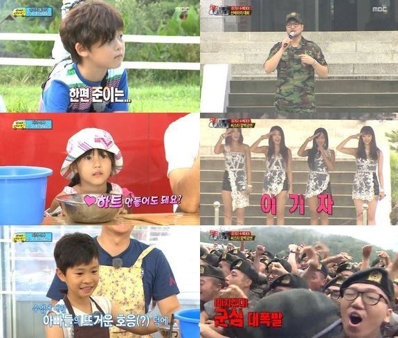 이날 ‘아빠! 어디가?’에서는 지난주에 이어 경기도 여주의 여름농장으로 여행을 떠난 다섯 가족의 모습이 그려졌고 ‘진짜 사나이’에서는 김태우와 씨스타가 이기자 부대를 방문해 축하 공연을 펼치는 과정이 그려졌다.