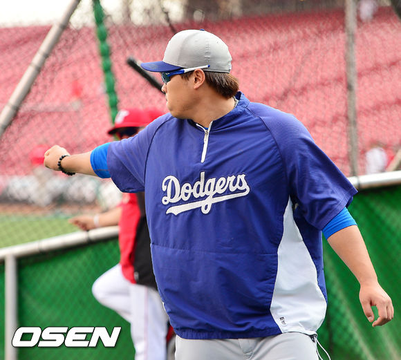 9일 (이하 한국시간) 미국 오하이오주 신시내티 그레이트 아메리칸 볼파크에서 2013 메이저리그 신시내티 레즈와 LA 다저스의 경기가 열릴 예정인 가운데 양팀 훈련시간에 다저스 류현진이 추신수 훈련을 바라보며 주먹을 불끈 쥐며 말을 하고 있다.