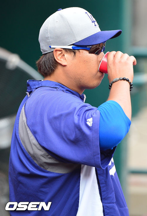 9일 (이하 한국시간) 미국 오하이오주 신시내티 그레이트 아메리칸 볼파크에서 2013 메이저리그 신시내티 레즈와 LA 다저스의 경기가 열릴 예정인 가운데 양팀 훈련시간에 다저스 류현진이 덕아웃에서 물을 마시고 있다.