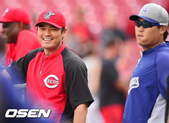 9일 (이하 한국시간) 미국 오하이오주 신시내티 그레이트 아메리칸 볼파크에서 2013 메이저리그 신시내티 레즈와 LA 다저스의 경기가 열릴 예정인 가운데 양팀 훈련시간에 신시내티 추신수가 다저스 류현진과 얘기를 나누며 환하게 미소짓고 있다.