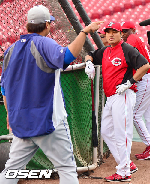 9일 (이하 한국시간) 미국 오하이오주 신시내티 그레이트 아메리칸 볼파크에서 2013 메이저리그 신시내티 레즈와 LA 다저스의 경기가 열릴 예정인 가운데 양팀 훈련시간에 다저스 류현진이 신시내티 추신수와 얘기를 나누고 있다.
