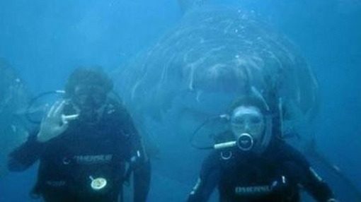 사진 속 잠수부들은 뭔가를 열심히 보고 있다. 물고기들의 멋진 군무일 수도 있고, 사라진 보물선을 발견한 것일 수도 있다. 어찌됐건 정면의 뭔가를 보느라 정신을 빼앗긴 잠수부 두 사람, 바로 그 뒤에는 큰 입을 벌려 날카로운 이빨을 드러낸 상어가 그 웅장한 자태를 드러내고 있다. ‘수영 중 최악의 만남’이란 바로 이런 것이다.