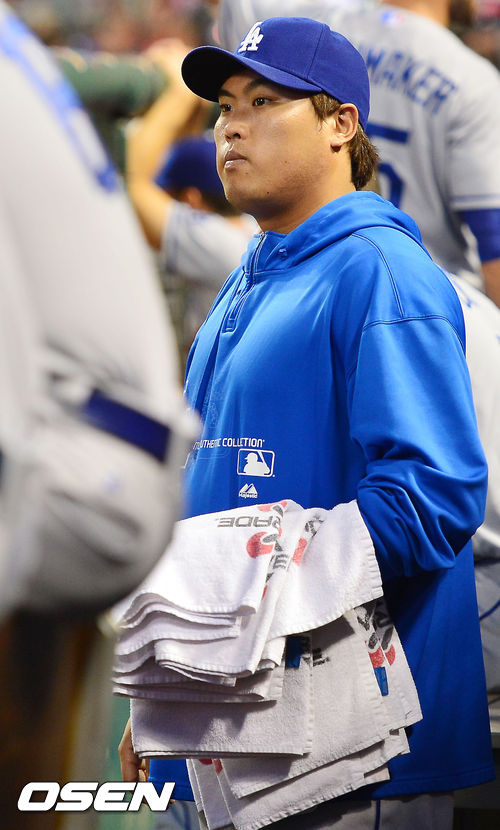 9일 (이하 한국시간) 미국 오하이오주 신시내티 그레이트 아메리칸 볼파크에서 열린 2013 메이저리그 신시내티 레즈와 LA 다저스의 경기, 다저스 덕아웃에서 류현진이 선수들에게 수건을 나눠주고 있다.