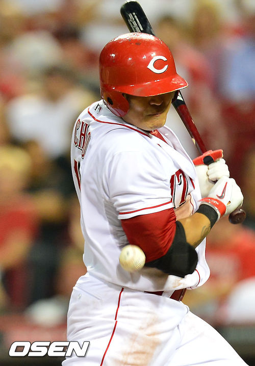9일 (이하 한국시간) 미국 오하이오주 신시내티 그레이트 아메리칸 볼파크에서 열린 2013 메이저리그 신시내티 레즈와 LA 다저스의 경기에서 7회말 2사 주자 2루 신시내티 추신수가 타석에서 다저스 선발 커쇼의 볼에 몸을 맞고 있다.
