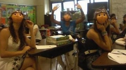 이 사진은 미국의 한 고등학생들이 수학 시간에 촬영한 것인데 선생님이 칠판에 글을 쓰는 동안 학생들이 공포스러운 마스크를 쓰고 이벤트를 하고 있다. 이 마스크는 미국 교육용 애니메이션에 나오는 캐릭터의 얼굴을 공포 영화 스타일로 바꾼 것으로 알려졌다.