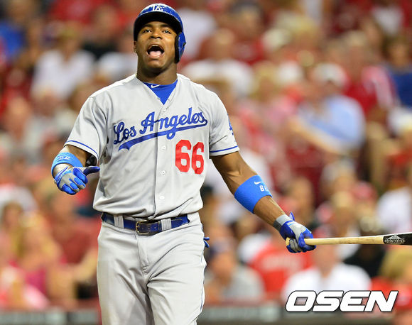 9일 (이하 한국시간) 미국 오하이오주 신시내티 그레이트 아메리칸 볼파크에서 열린 2013 메이저리그 신시내티 레즈와 LA 다저스의 경기에서 8회초 1사 다저스 푸이그가 타석에서 헛스윙을 한 후 아쉬워하고 있다.