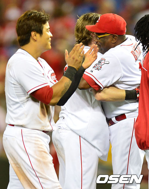 경기를 마치고 끝내기 안타를 날린 신시내티 하니건이 베이커 감독과 포옹을 나눌때 추신수가 박수를 보내고 있다. / rumi@osen.co.kr