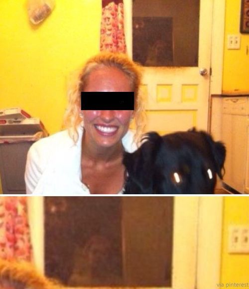 최근 페이스북을 통해 공개된 이 사진에는 애완견과 다정하게 사진을 찍고 있는 여성의 모습이 나온다. 그런데 뒤쪽 문의 창문에 사람의 형상이 찍혀 있어 오싹함을 느끼게 한다.