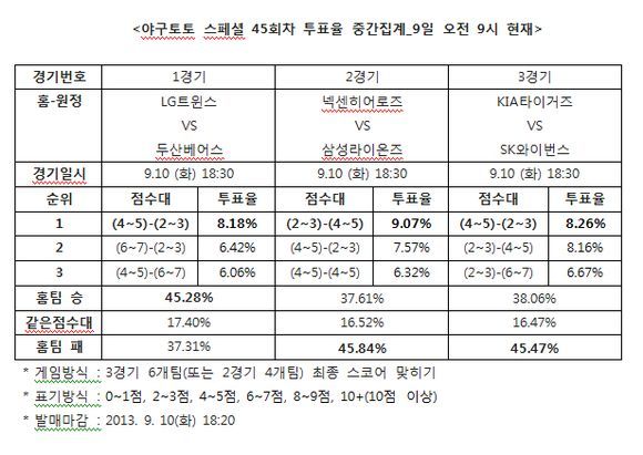 KBO 3경기 대상 야구토토 스페셜 45회차 투표율 중간집계