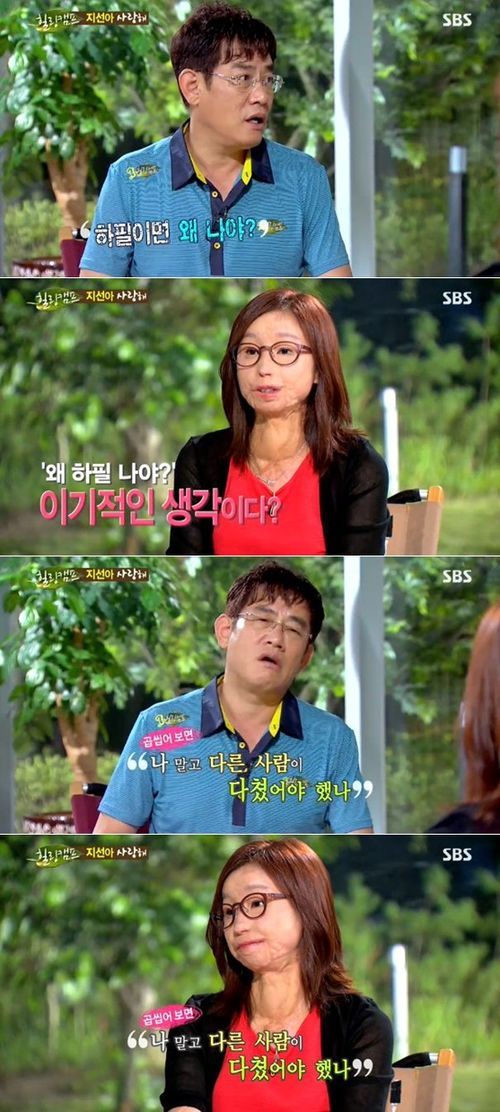 MC인 이경규가 '왜 하필 나야?'라는 생각을 갖지 않았느냐고 묻자 "'왜 하필 나야?'라는 생각은 굉장히 이기적인 생각이다. 그렇다면 '나 말고 다른 사람이 다쳤어야 했나?'라는 게 된다"고 말했다.