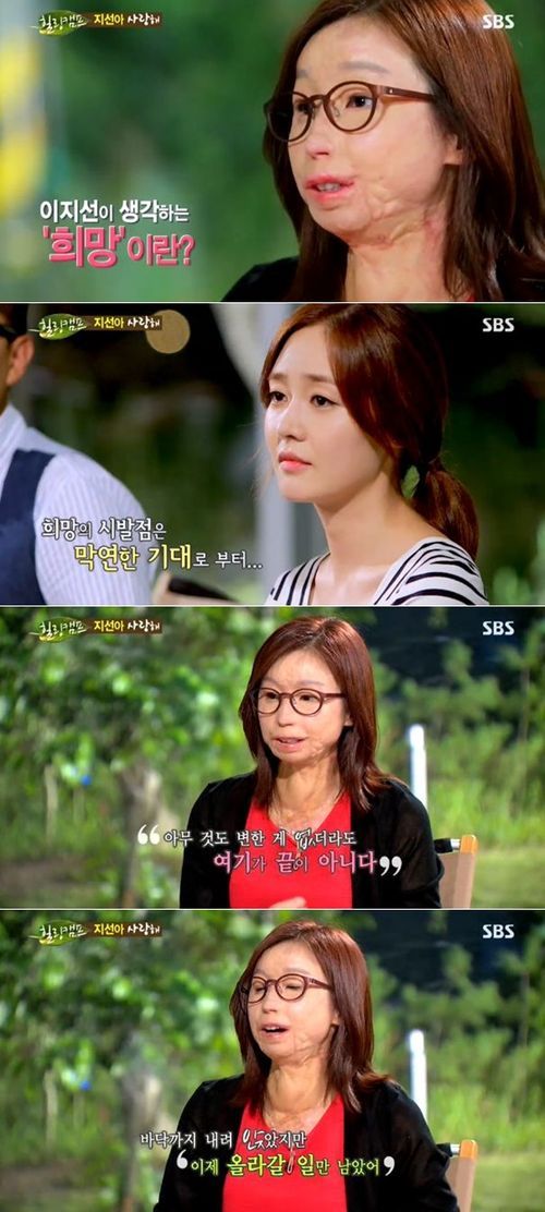 또한 이날 이지선은 자신이 마주했던 사고에 대해 "사고를 만난 후 생일이 2개가 됐다. 어머니가 낳아주신 날, 사고를 만난 날"이라고 표현해 긍정적인 사고를 내비쳤다.