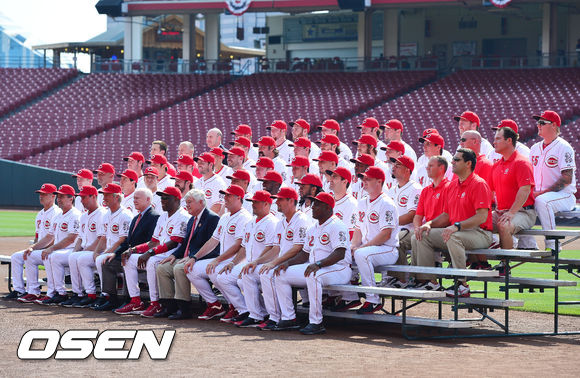 10일 (이하 한국시간) 미국 오하이오주 신시내티 그레이트 아메리칸 볼파크에서 2013 메이저리그 신시내티 레즈와 시카고 컵스의 경기가 열릴 예정인 가운데, 신시내티 선수들과 감독, 코치진 및 임원진과 스테프들이 포토타임을 갖고 있다.