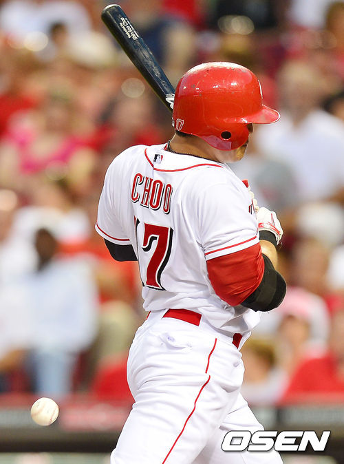 10일 (이하 한국시간) 미국 오하이오주 신시내티 그레이트 아메리칸 볼파크에서 열린 2013 메이저리그 신시내티 레즈와 시카고 컵스의 경기, 3회말 1사 주자 없는 상황에서 신시내티 추신수가 타석에서 몸에 공을 맞고 있다.