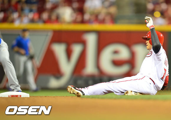 10일 (이하 한국시간) 미국 오하이오주 신시내티 그레이트 아메리칸 볼파크에서 열린 2013 메이저리그 신시내티 레즈와 시카고 컵스의 경기, 5회말 1사 주자 없는 상황에서 신시내티 추신수가 좌전 2루타를 날린 후 2루로 몸을 날리고 있다.
