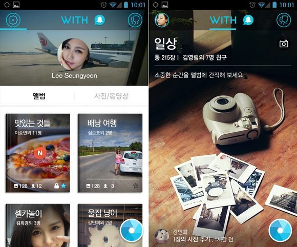 앨범 SNS 위드는 빠른 네트워크 구성과 사진 앨범 생성, 편리한 사진 공유가 강점이다. 내 모바일 기기 주소록에 저장된 친구 중 위드 사용자들과는 바로 위드 친구로 맺어진다. 별도의 친구 신청이나 수락 과정을 거치지 않아도 된다. 위드 친구들이 올린 사진은 모아보기를 통해 시간 순으로 화보처럼 확인할 수 있고 개별 사진에 대한 댓글이나 호감도를 남기는 것도 가능하다.