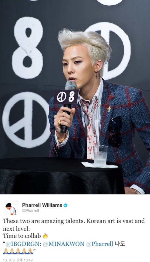 퍼렐은 지난 9일 자신의 트위터에 "이 둘은 대단한 재능을 가지고 있다. 한국 예술은 앞서 나간다. 이제는 콜라보 할 차례"라며 지드래곤을 언급했다. 해당 글의 '두 사람'은 지드래곤과 앨범 아트 디자이너로 활약 중인 지드래곤의 지인 권민아를 지칭한 것이다.
