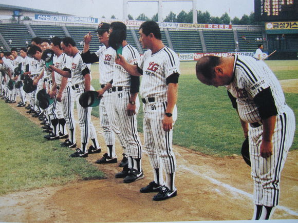 1991년 7월 11일, 백인천 감독(맨 오른쪽)을 비롯한 LG 선수단이 잠실구장에서 그 전날 일어났던 정삼흠의 빈볼 소동과 관련, 팬들에게 모자를 벗고 마리를 숙여 사과 인사를 하고 있다.(제공=일간스포츠)