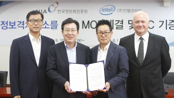 왼쪽부터 김경섭 한국정보화진흥원 부원장, 장광수 원장, 이희성 인텔코리아 사장, 고든 그레이리시 인텔 부사장./ 인텔코리아 제공.