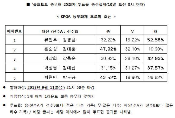같은 날 웰리힐리CC에서 열리는 ‘국내남자프로골프투어(KPGA) 동부화재 프로미 오픈’ 을 대상으로 하는 승무패 25회차에서는 국내골프의 강자 강경남(52.56%)이 류현우(32.22%)를 누를 것으로 예상한 참가자가 많았다.