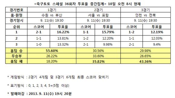 K리그 클래식 3경기 대상 축구토토 스페셜 36회차 투표율 중간집계 결과