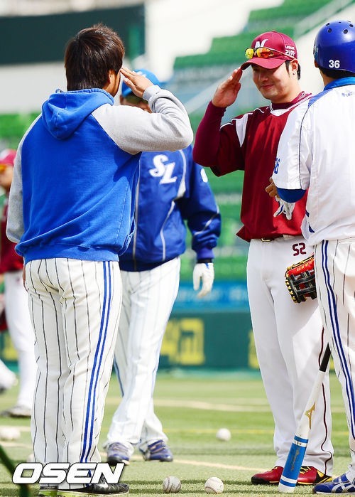박석민 박병호가 지난 3월 대구에서 만나 인사를 하고 있다.