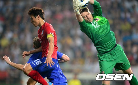 전반 한국 구자철의 헤딩에 앞서 크로아티아 골키퍼가 볼을 따내고 있다.