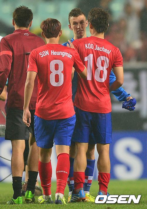 손흥민과 구자철이 독일 볼프스부르크 팀 동료인 이반 페리시치와 인사를 나누고 있다./dreamer@osen.co.kr