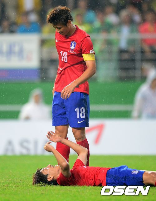 후반 한국 구자철이 아쉬워 하는 이청용을 일으켜 세우고 있다./jpnews@osen.co.kr