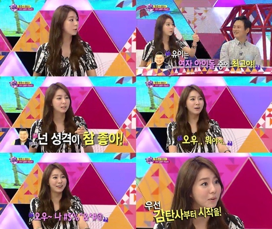 이날 유이는 '사석에서 인기 없는 여자연예인 1위'라는 풍문에 대해 "애교가 없어서인지 남자연예인에게 인기 없기로 유명하다. 남자연예인에게 연락도 받아본 적이 없다. 혹시 내가 무서운 이미지인가?"라고 말문을 열었다.