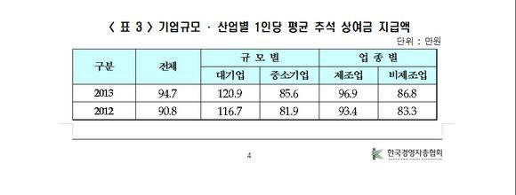 올해 추석 상여금을 지급하는 기업들은 근로자 1인당 평균 94만7천원의 상여금을 지급할 것으로 조사되었다. 이는 작년보다 4.3%(3만 9천원) 증가한 수준이다. 기업규모별로는 대기업이 120만 9천원으로 작년에 비해 4만 2천원, 중소기업은 85만 6천원으로 작년에 비해 3만 7천원 늘었다.